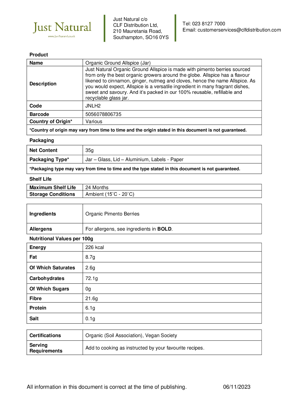 Just Natural Organic Ground Allspice is made with pimento berries sourced from only the best organic growers around the globe. Allspice has a flavour likened to cinnamon, ginger, nutmeg and cloves, hence the name Allspice. As you would expect, Allspice is a versatile ingredient in many fragrant dishes, sweet and savoury. And it's packed in our 100% reusable, refillable and recyclable glass jar. For nutritional information and ingredients, click Further Information.