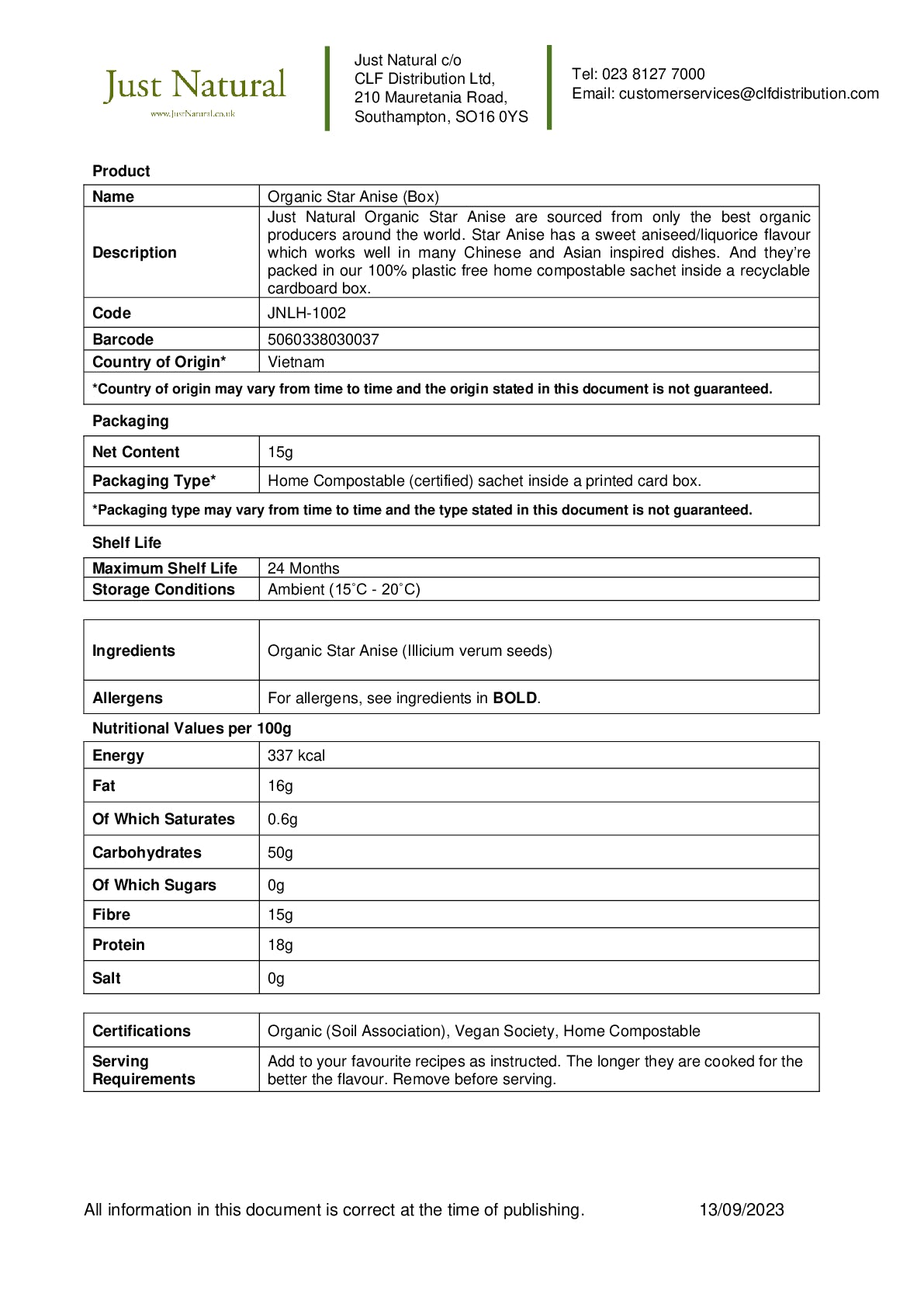 Just Natural Organic Star Anise are sourced from only the best organic producers around the world. Star Anise has a sweet aniseed/liquorice flavour which works well in many Chinese and Asian inspired dishes. And they're packed in our 100% plastic free home compostable sachet inside a recyclable cardboard box. For nutritional information and ingredients, click Further Information.