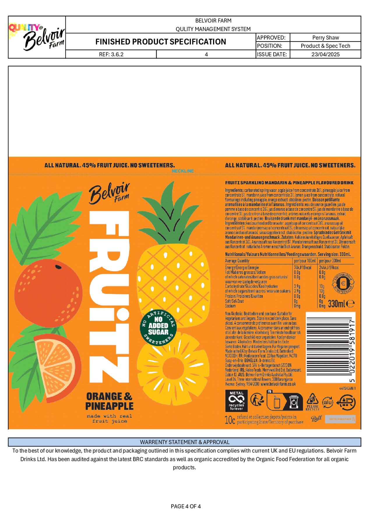 FRUiTZ Orange & Pineapple is bursting with 45% real fruit juice and absolutely nothing artiicial. It is full of fresh fruity flavours and is 100% natural. We have carefully blended tropical Pineapple juice with sweet, citrus Mandarin Orange, added some apple juice for natural sweetness and a touch of fresh lemon juice to help balance the flavours for a deliciously refreshing drink that all the family can enjoy.