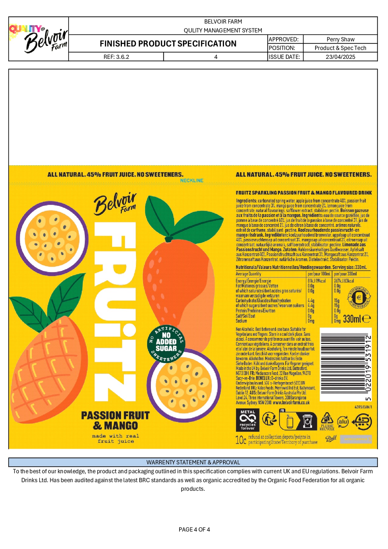 FRUiTZ Passion Fruit & Mango is bursting with 45% real fruit and absolutely nothing artificial. Full of fresh fruity flavours and 100% natural. We've carefully blended a sweet and tropical Passion Fruit Juice with a rich & syrupy Mango Juice, added some apple juice for some natural sweetness and a touch of lemon juice to help balance the flavours for a deliciously refreshing drink all the family can enjoy.