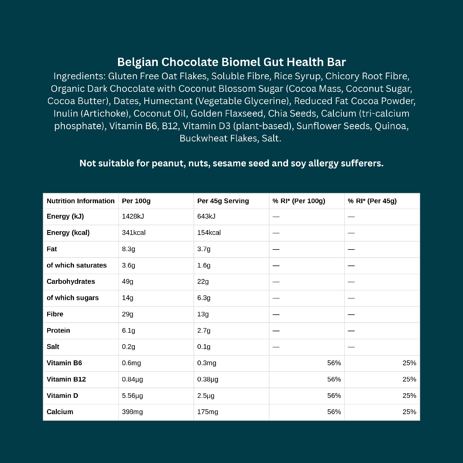 Biomel Belgian Chocolate Gut Health Bar, High Fibre, Gluten Free, Vegan, 100% Natural