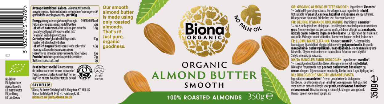 Only the finest freshly roasted sweet almonds are milled to create this creamy, smooth Biona nut butter. With no added sugar or salt, you can enjoy it as nature intended. Spread it over hot rye toast, stir it into your favourite porridge recipe or even use it to create rich salad dressings or to give smoothies a protein hit. No additives such as palm fats or emulsifiers, BPA free lid.