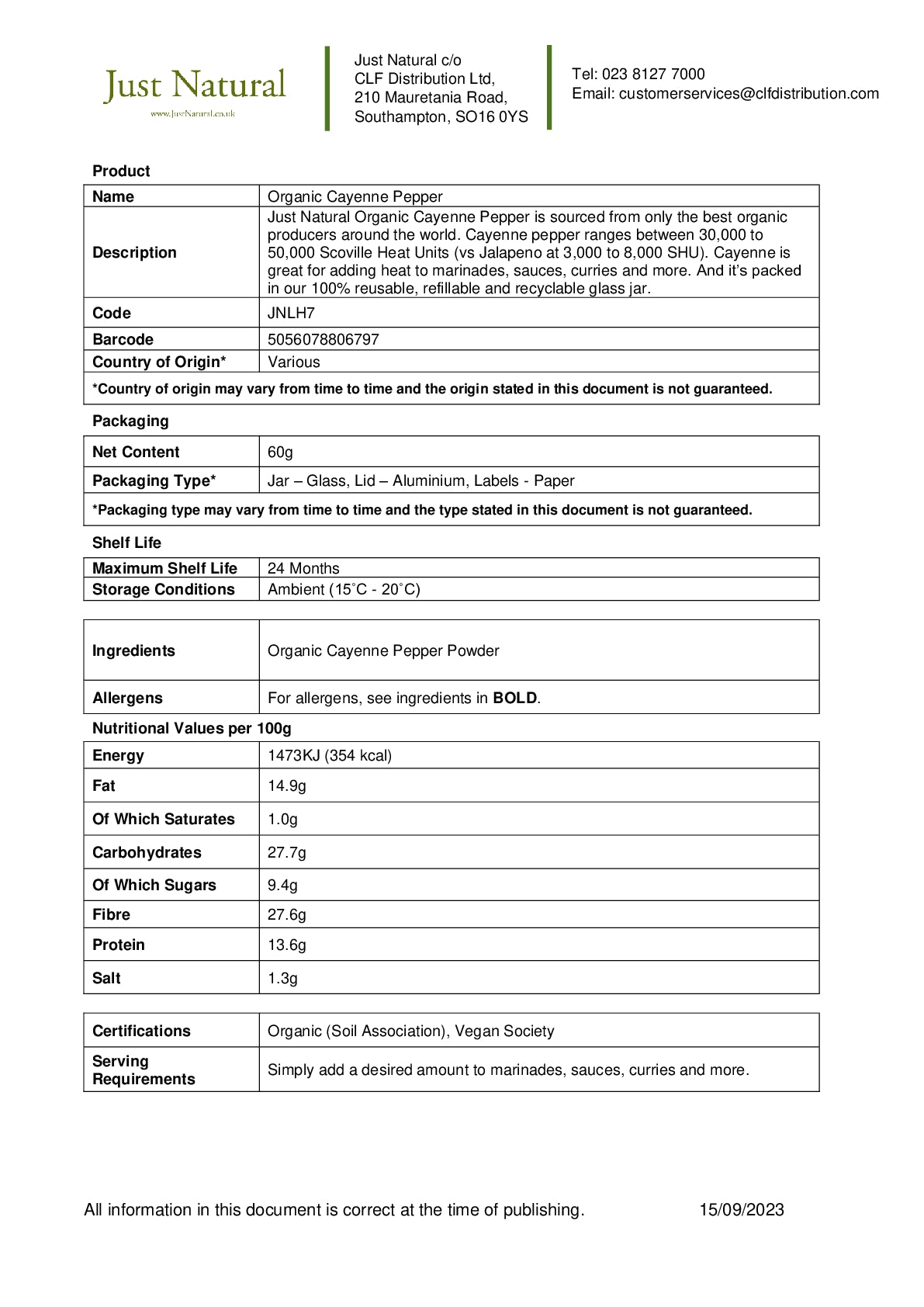 Just Natural Organic Cayenne Pepper is sourced from only the best organic producers around the world. Cayenne pepper ranges between 30,000 to 50,000 Scoville Heat Units (vs Jalapeno at 3,000 to 8,000 SHU). Cayenne is great for adding heat to marinades, sauces, curries and more. And it's packed in our 100% reusable, refillable and recyclable glass jar. For nutritional information and ingredients, click Further Information.