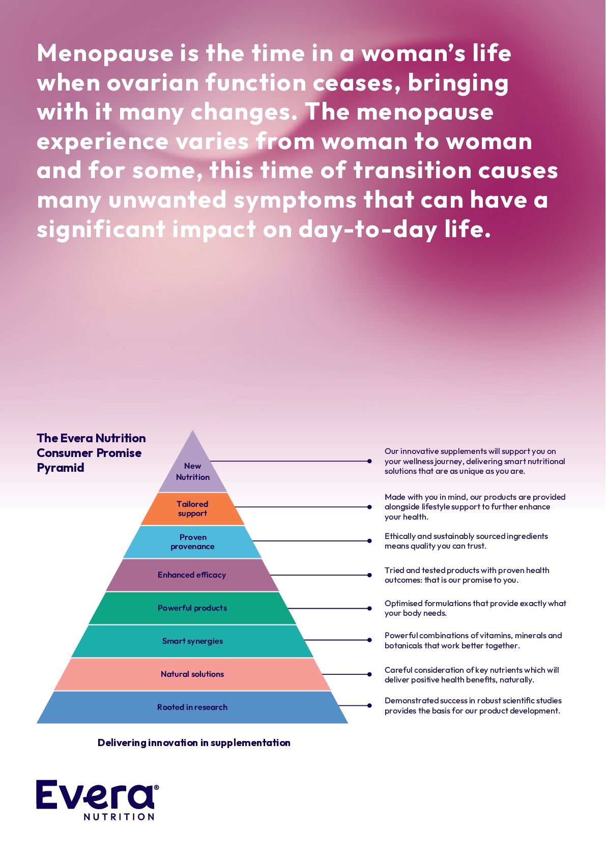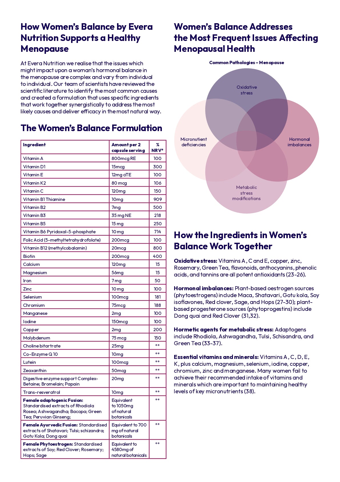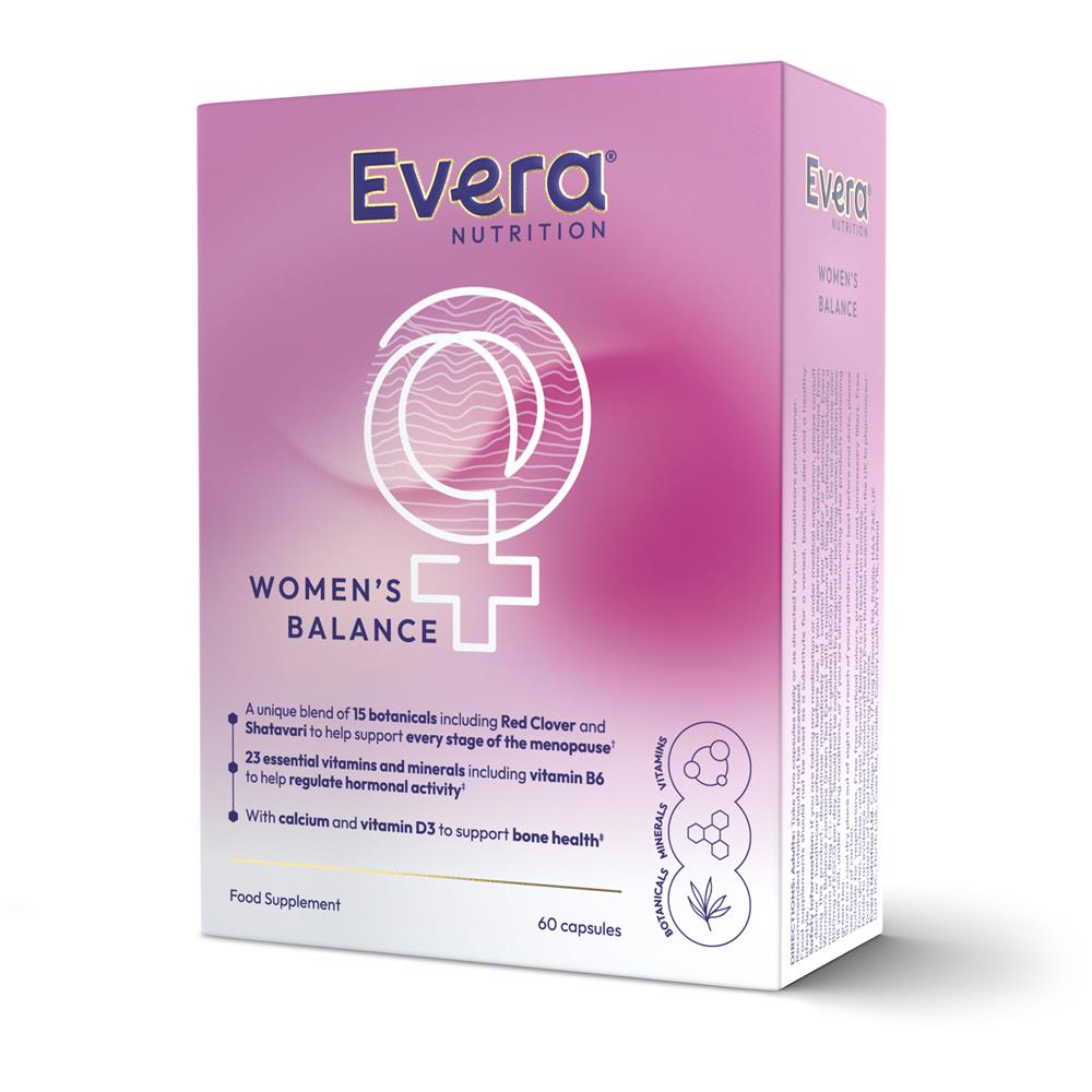 "Women's Balance by Evera Nutrition is a unique blend of vitamins, minerals, and botanicals designed to support your body and mind through every stage of the menopause - pre, peri and post - so you can feel balanced, calm, and like yourself again.