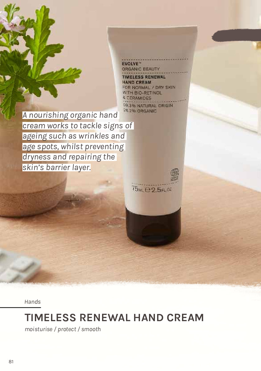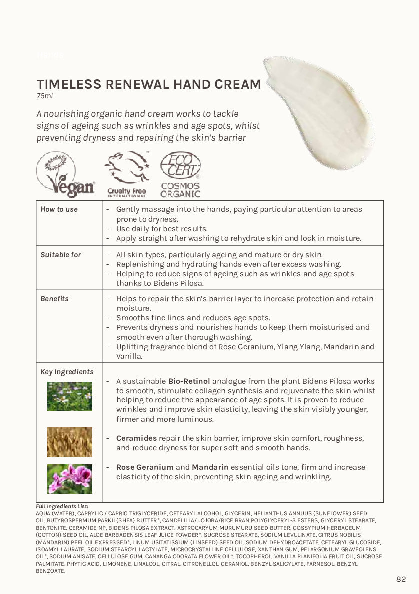 Our Timeless Renewal Hand Cream is an innovative formula designed to reduce signs of ageing on the skin and leave hands hydrated, smooth and protected.