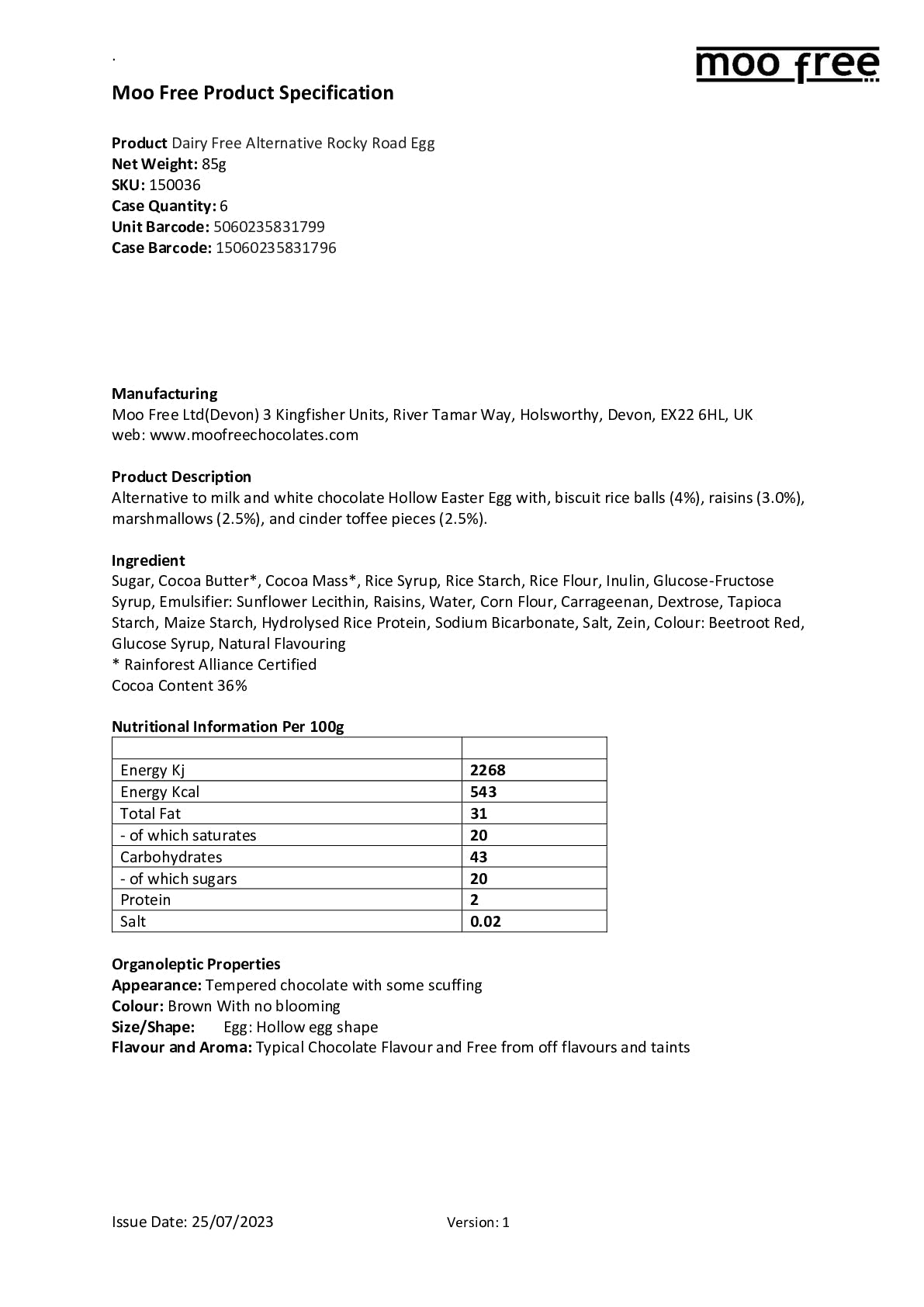 Alternative to milk and white chocolate Hollow Easter Egg with, biscuit rice balls (4%), raisins (3.0%), marshmallows (2.5%), and cinder toffee pieces (2.5%).