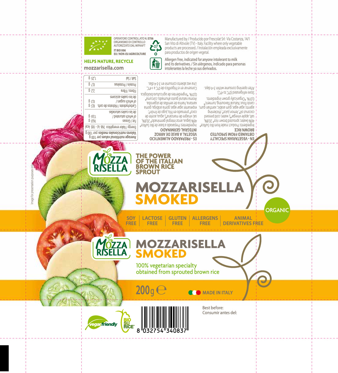 Vegan Mozzarella Smoked flavour is a preferred ingredient for sandwiches, bruschettas, pizza, salads, timbals and salty cakes. Ideal also for snack topping or as appetizer complement.