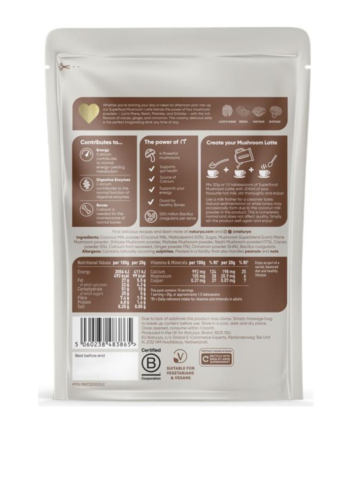 Whether it's the way you start your day or an afternoon pick me up, our Superfood Mushroom Latte combines lion's mane, shiitake, reishi, maitake, coconut milk, cacao and cinnamon to create a great tasting, creamy latte with a hint of sweetness for an energising pick me up that's perfect anytime of the day. This nutrient dense Superfood latte contains added Calcium from a natural source of seaweed
