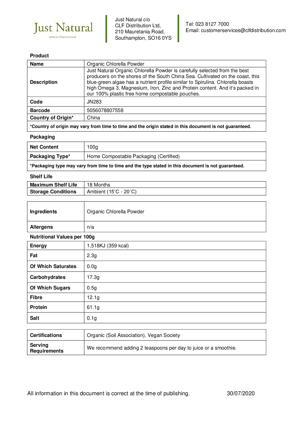 Just Natural Organic Chlorella Powder is carefully selected from the best producers on the shores of the South China Sea. Cultivated on the coast, this blue-green algae has a nutrient profile similar to Spirulina. Chlorella boasts high Omega 3, Magnesium, Iron, Zinc and Protein content. And it's packed in our 100% plastic free home compostable pouches.