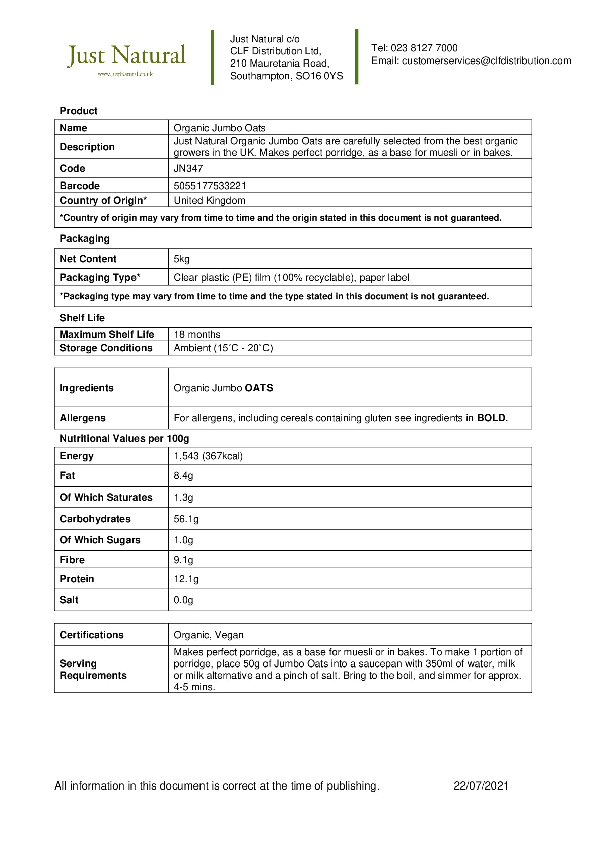 Just Natural Organic Jumbo Oats are carefully selected from the best organic growers in the UK. Makes perfect porridge, as a base for muesli or in bakes. Our mid bulk packs are packed in 100% recyclable film.