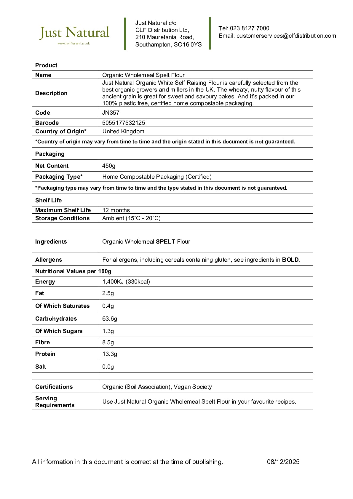 Just Natural Organic Wholemeal Spelt Flour is carefully selected from the best organic growers around the world. Our mid bulk packs are packed in 100% recyclable film.
