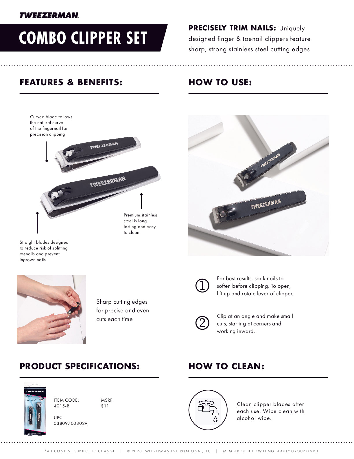 Precisely trim fingernails and toenails with the Combo Clipper Set. Clippers feature sharp, strong stainless steel cutting edges for easy maintenance.