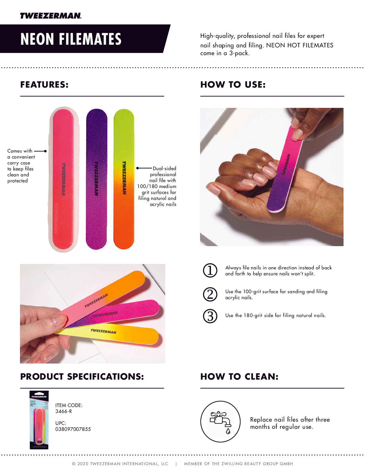 Tweezerman Neon Filemates are high-quality, professional nail files for expert nail shaping and filing. Neon Hot Filemates come in a 3-pack. Key Benefits: Dual-sided professional nail file with 100/180 medium and fine grit surfaces for filing natural and acrylic nails.