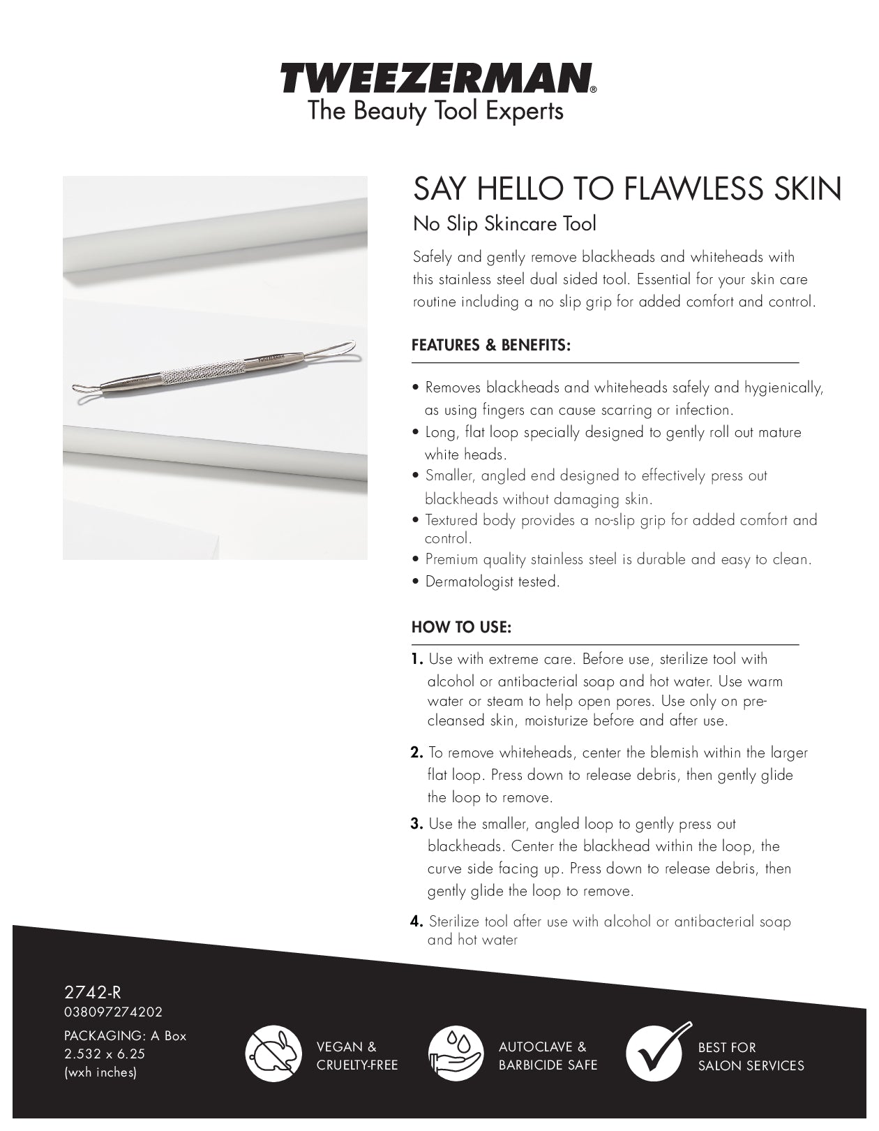 Use with extreme care. Before use, sterilize tool with alcohol or antibacterial soap and hot water. Take a hot, steamy shower or use a hot washcloth to open pores. Use only on pre-cleansed skin. For whiteheads, gently glide the long, flat loop over it to release debris from the pore. Use the opposite side's smaller, to gently press out blackheads.